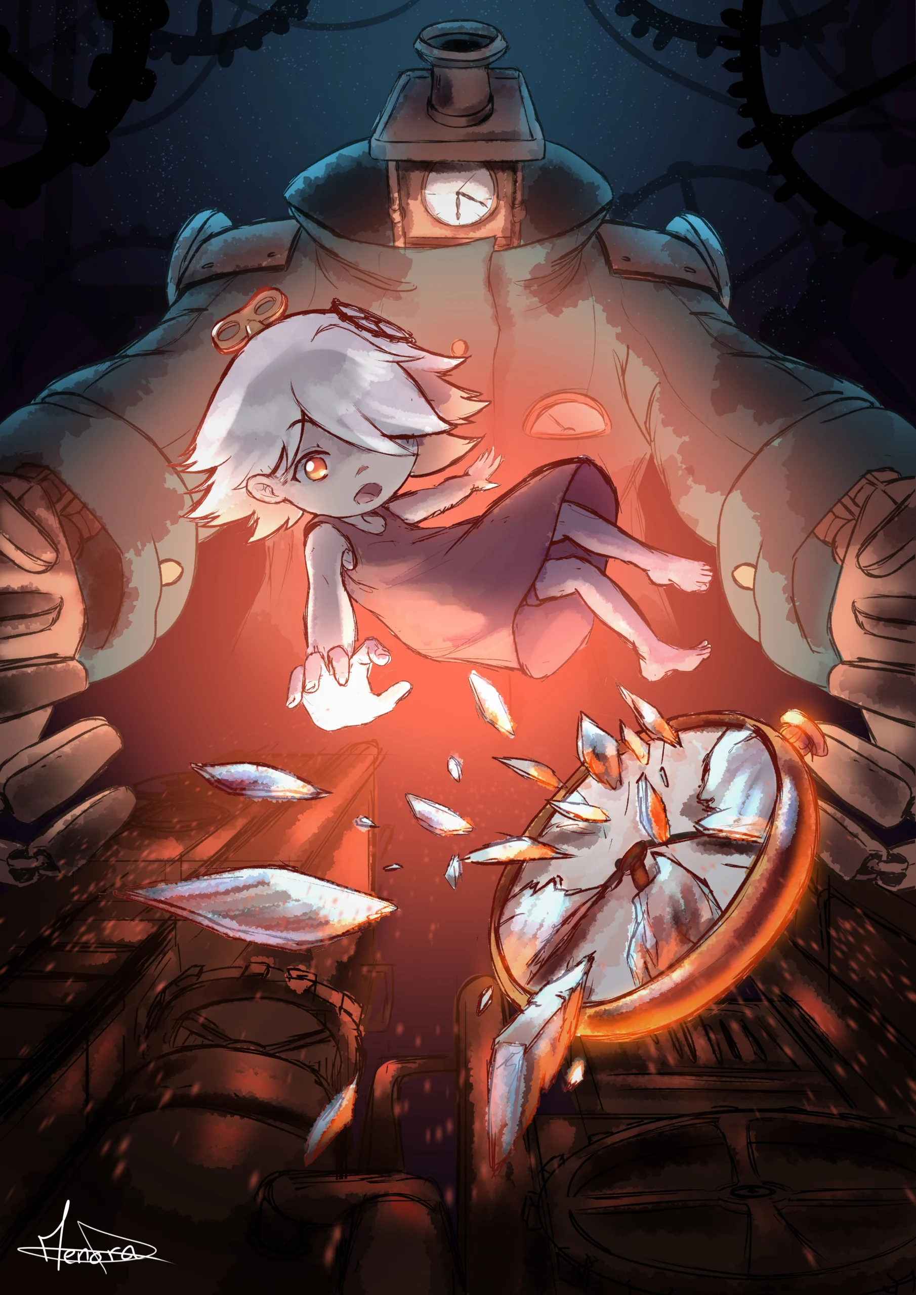 Dans cet espace vide de vie, seules des machines s’animent et s’activent pour s’occuper des caprices de la machinerie. Parmi elles se trouvent le Gardien des Rouages, leur créateur, lui-même créé par l’Autre. Celui-ci vit seul, imperturbable comme le Temps…